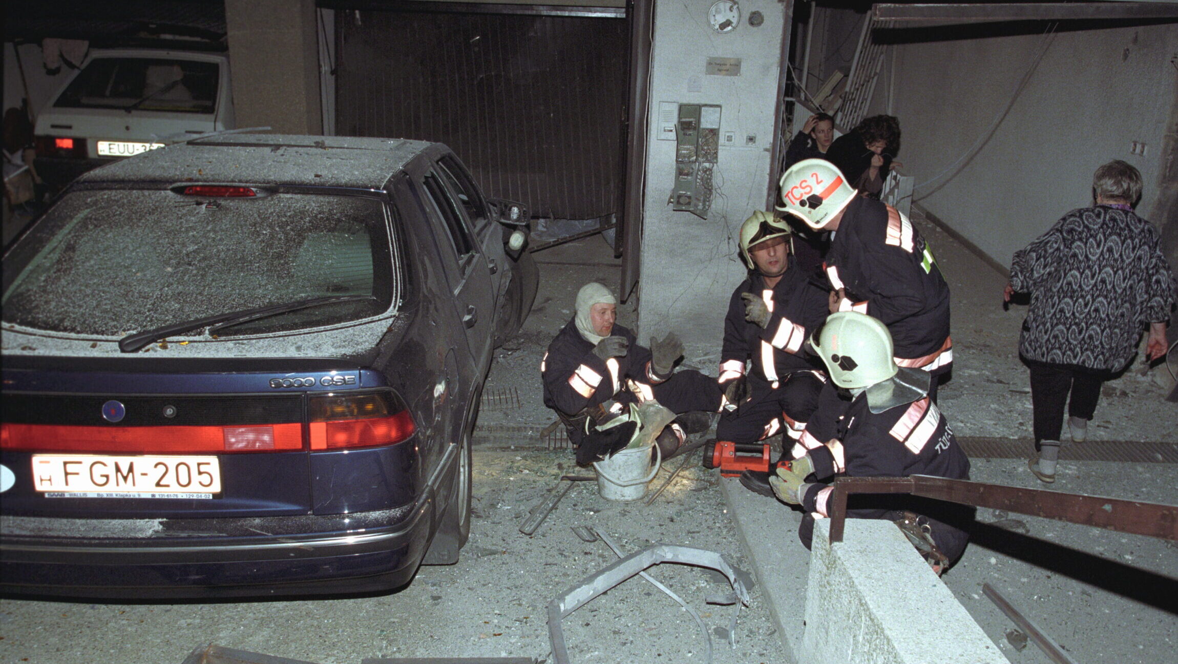 Tűzoltók 1998. március 17.-én az Endrődi utca 60-as számú társasháznál, Torgyán József, a Független Kisgazdapárt elnökének otthonánál, ahol robbantás történt. (fotó: MTI/Mihádák Zoltán)