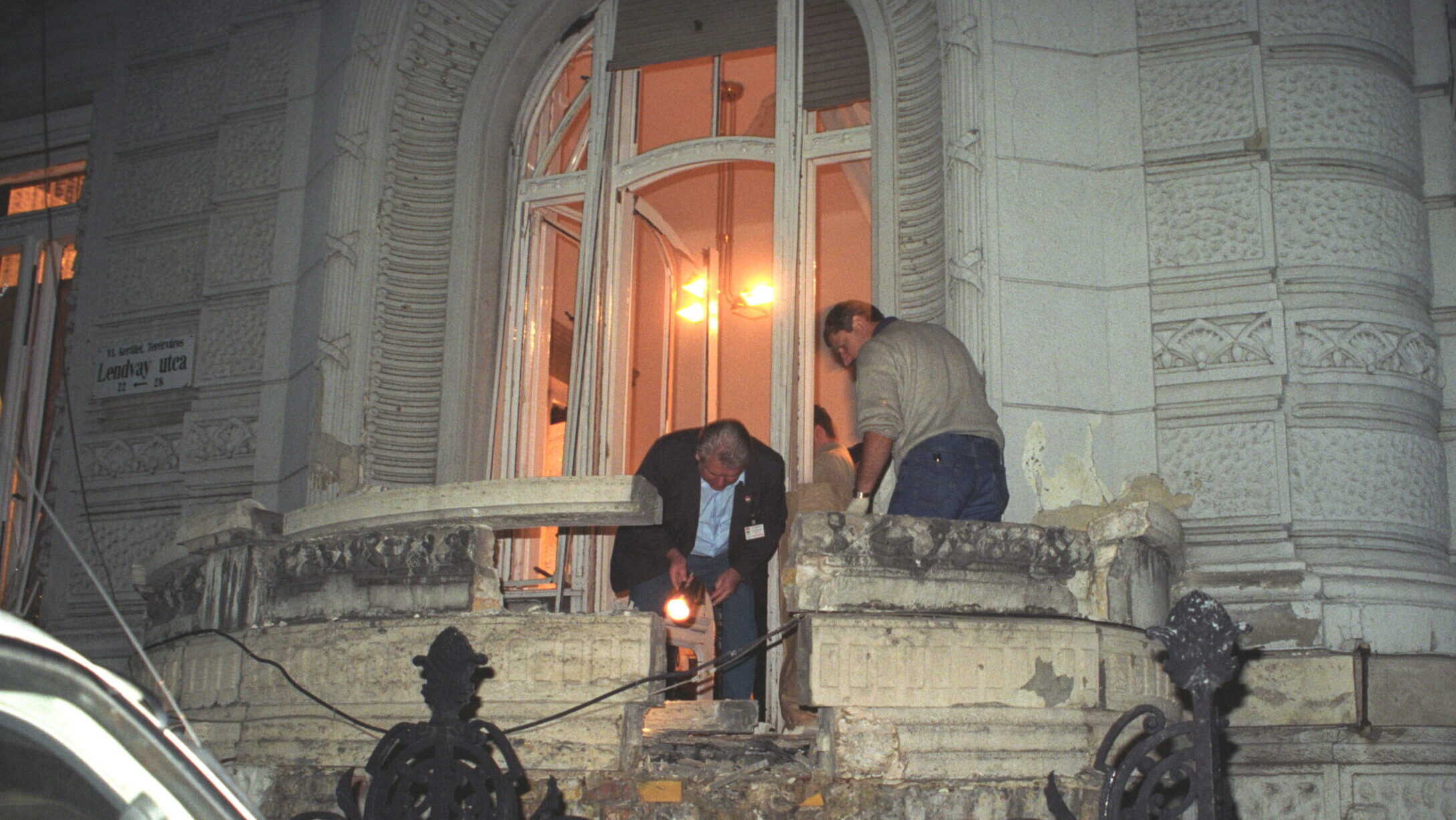 Rendőrök helyszínelnek a FIDESZ Magyar Polgári Párt Lendvay utcai székházánál 1998. június 15-én hajnalban, ahol előzőleg pokolgép robbant. (Fotó: MTI/Mihádák Zoltán)