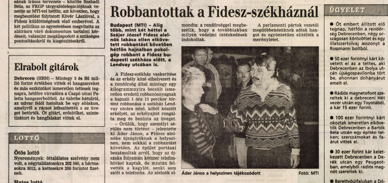 Holott volt még egy célpont: Áder János. Megkeresésünkben rá is kérdeztünk, hogy nyomozás megszüntetéséről szóló hírek csak az FKGP-székháznál, illetve a Torgyán-, és Szájer-lakásnál történt robbantások, illetve merényletkísérlet ügyében történt eljárás lezárását említik. A Fidesz-székháznál történt robbantás ügyében külön nyomozás volt? Ha igen, az milyen eredményre jutott, s mikor szüntették meg? – tudakoltuk.