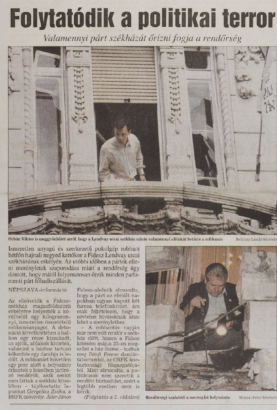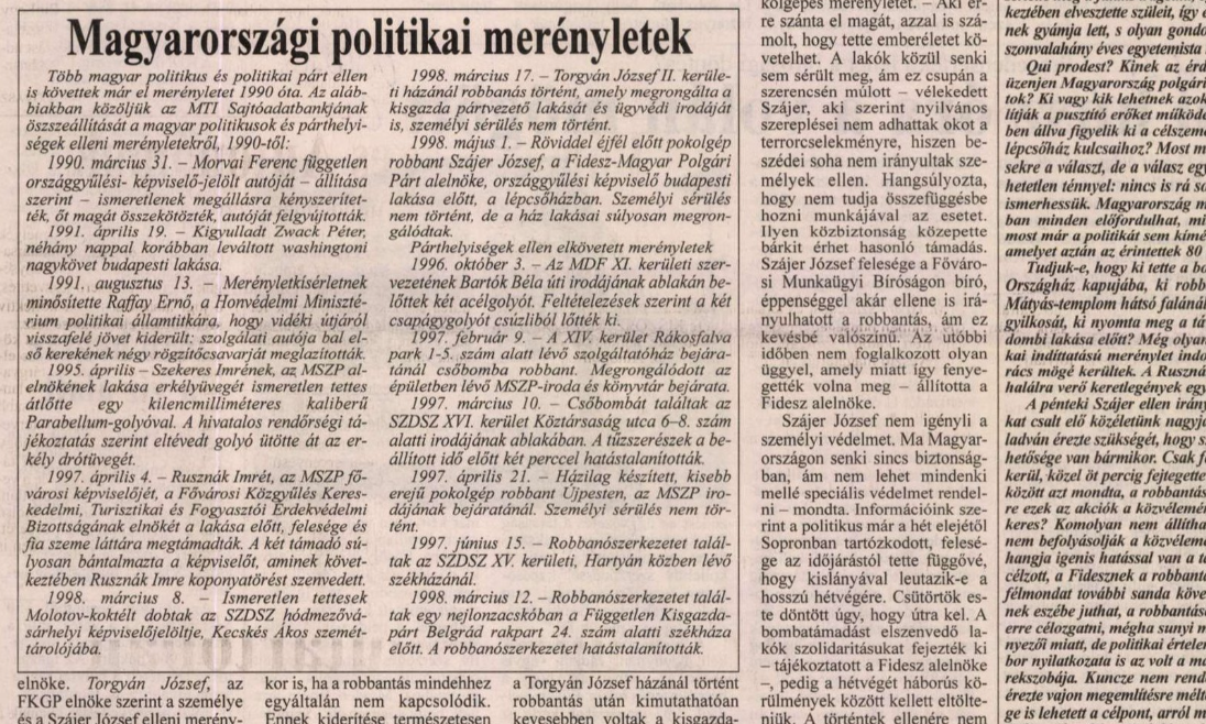 Az 1998-as választási kampány alatt, a Horn Gyula vezette MSZP-SZDSZ kormány idején politikai célú – politikusok és pártszékházak ellen irányuló – robbantásokat hajtottak végre Magyarországon. 1998. március 12-én a Független Kisgazdapárt székházánál próbáltak robbantani, aztán 1998. március 16-án Torgyán József kisgazda pártelnök, későbbi miniszter lakásánál, 1998. május 1-én Szájer József fideszes frakcióvezető és felesége otthonánál, 1998. június 15-én pedig Áder János későbbi házelnöknek a Fidesz-székházban lévő irodájánál történt bombamerénylet. Az ügyben indított nyomozás eredménytelenül zárult, s mivel azóta a bűncselekmény rég elévült, a tettesekkel szemben már nem lehet vádat emelni.