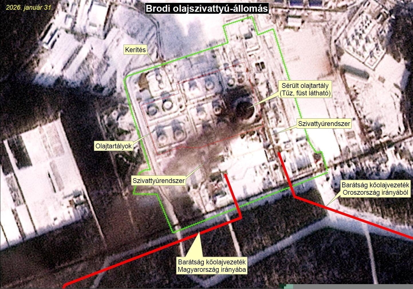 Infografikák: Átlátszó/Szabó Krisztián. Címlapfotó: A Miniszterelnöki Kommunikációs Főosztály által 2026. március 2-án, a nemzetbiztonsági egyeztetést követően közreadott műholdfelvétel a Barátság kőolajvezeték és a Brodi olajszivattyú-állomás 2026. január 31-i állapotáról. MTI/Miniszterelnöki Kommunikációs Főosztály