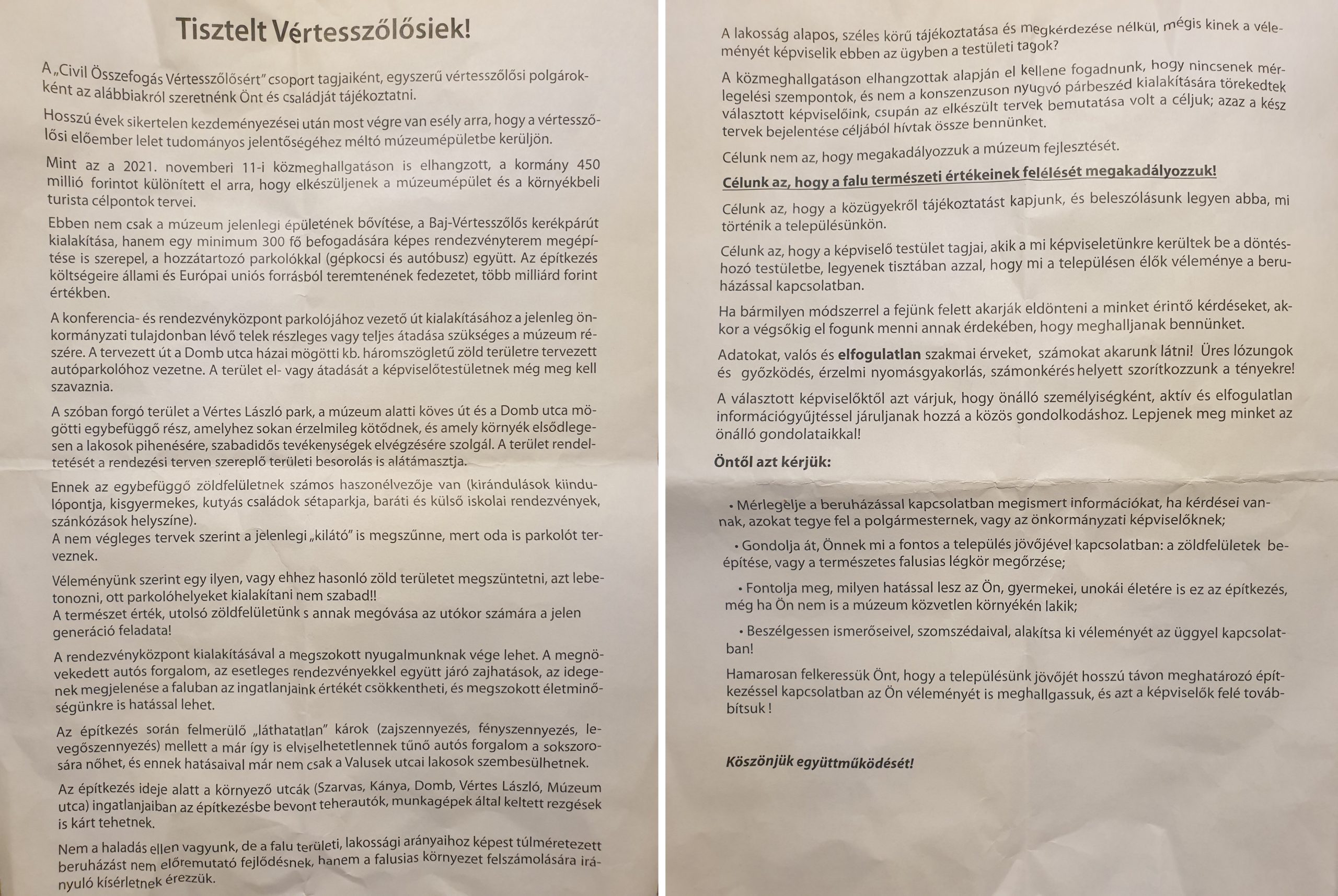 Az Átlátszó birtokába került szórólapon – amely inkább egy levél –, a küldői megismétlik, hogy nem a haladás ellen vannak, „de a falu területi, lakossági arányaihoz képest túlméretezett beruházást nem előremutató fejlődésnek, hanem a falusias környezet felszámolására irányuló kísérletnek” érzik. A levél szövege szerint nem a múzeum fejlesztését, hanem a falu természeti értékeinek felélését szeretnék megakadályozni. Emellett szeretnék elérni, hogy megfelelő tájékoztatást kapjon a lakosság, és a képviselők valóban a lakosság véleményének ismeretében végezzék a képviselői feladatukat, általuk beleszólásuk legyen abba, ami a településen történik.