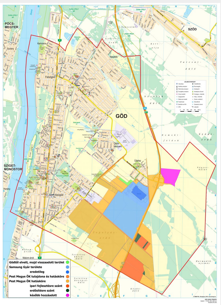 A Gödi Különleges Gazdasági Övezet (GKGÖ). A Samsung-gyárkomplexum kékkel jelölt, kb. 120 hektáros területe mellett a térkép egyrészt sárgával jelöli a 420 hektáros GKGÖ többi részét; a narancssárga szín egy újabb 40 hektáros ipari parkot jelöl, a sötétzöld szín pedig a véderdősítésre szánt területet jelöli. A lila szín a villamos energia-ellátást biztosító transzformátor-állomások számára újonnan kijelölt terület. (Forrás: god.hu)