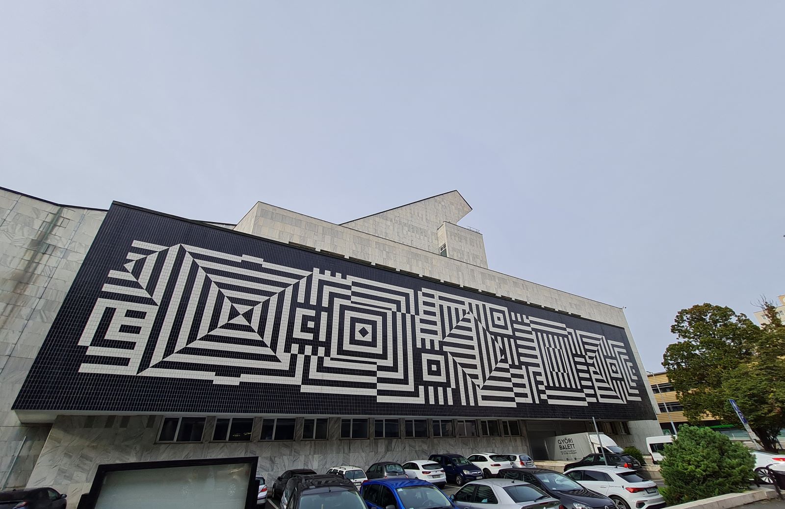 Fotó: Győri Nemzeti Színház oldalát Viktor Vasarely kerámiaképe burkolja (a szerző fotója)