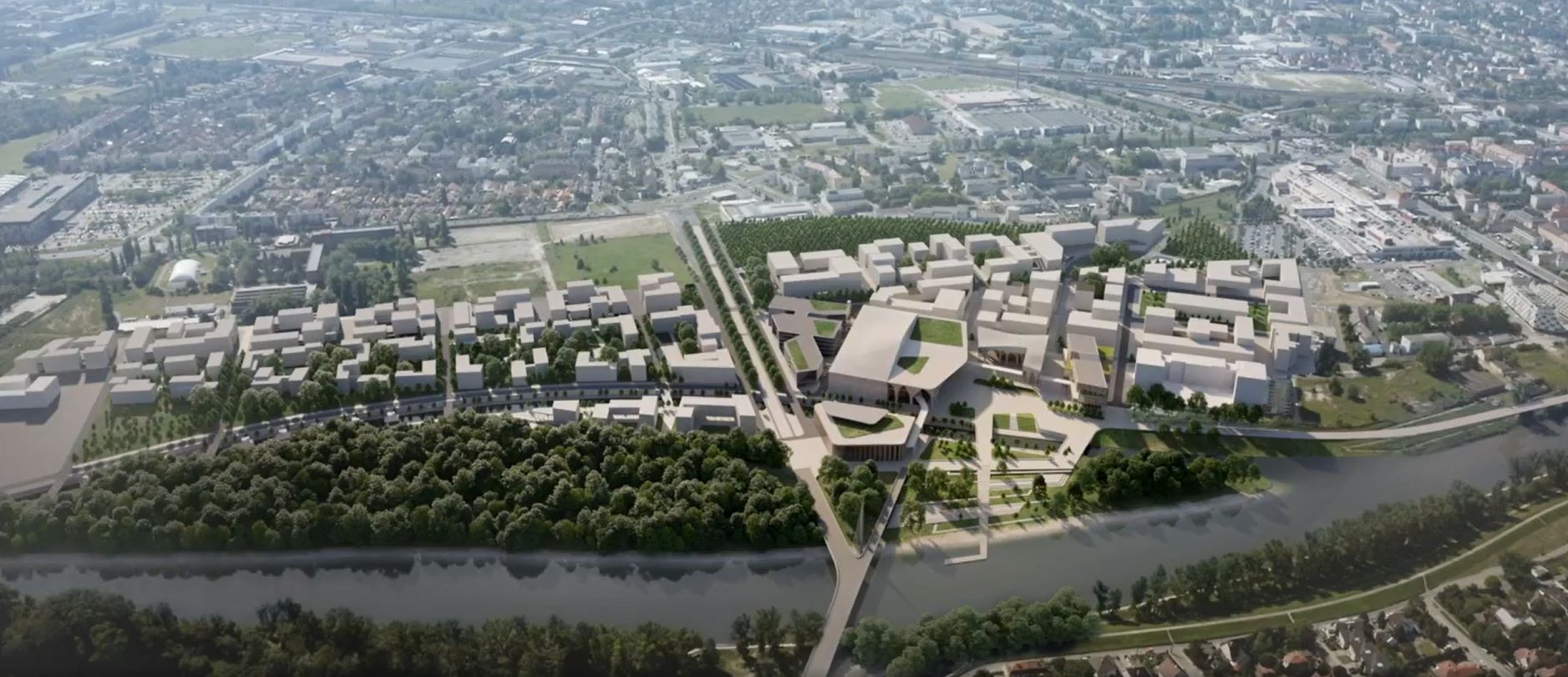 A Mosoni-Duna partján egy teljes városrész épülne. Nemcsak a színház költözne át a belvárosból, hanem a bábszínház, a balett, a filharmonikus zenekar, a korábbi ifjúsági ház is. Lenne ott még közlekedési múzeum, hajókikötő, továbbá irodaházakat és szállodát terveztek ide. Az egyik legnagyobb attrakció a fejlesztési terület közepén kialakított hajózható csatorna  lenne, ami által a fás terület egy mesterséges szigetet alkotna.