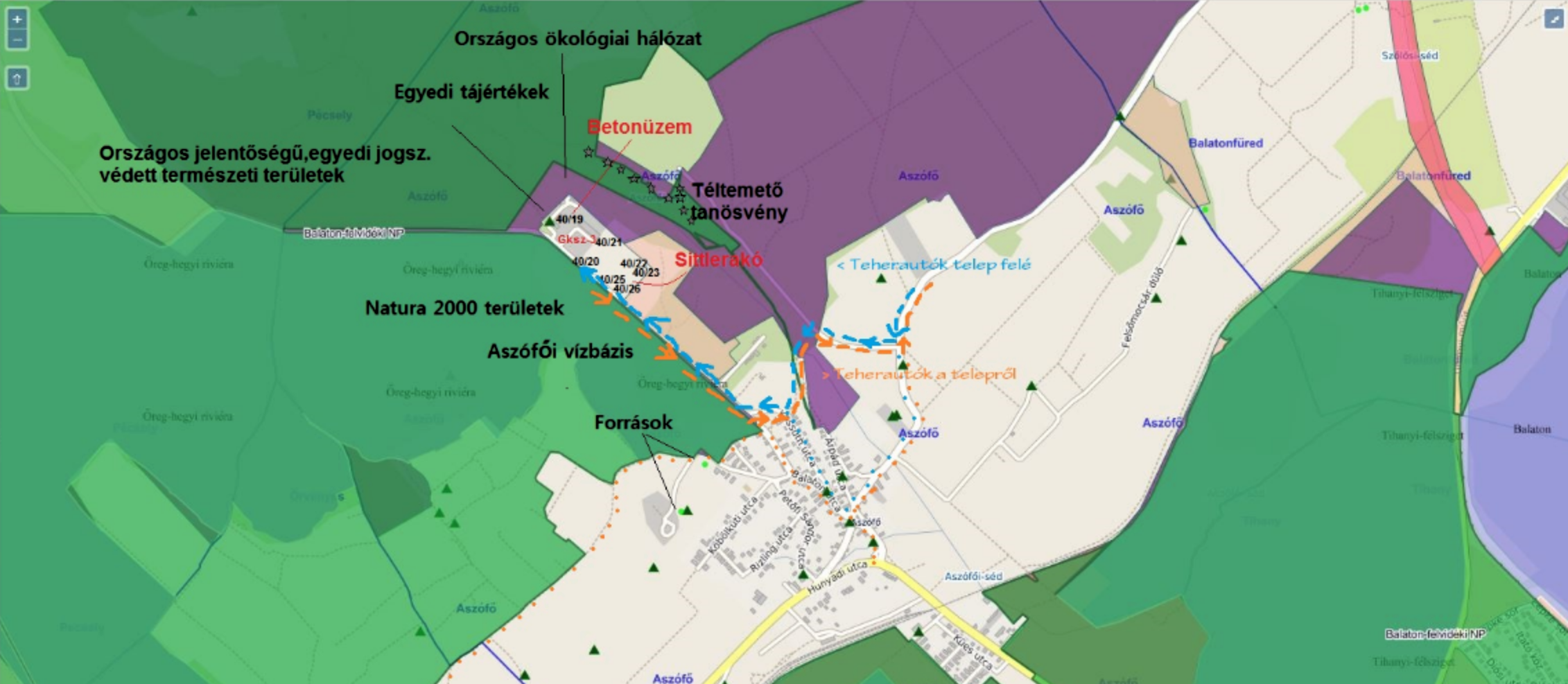 A Molnárbeton Kft. üzeme Natura 2000 besorolású terület és az aszófői vízbázis szomszédságában, a fokozottan védett téltemető tanösvény közelében működik. (Forrás: olvasónk által szerkesztett térkép)