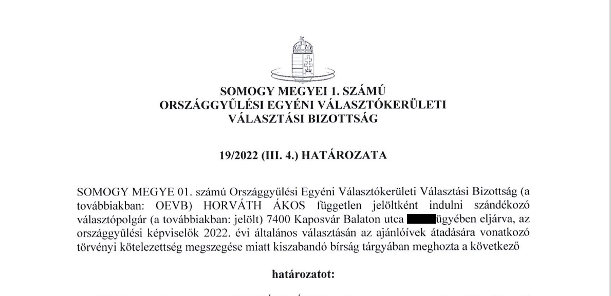 Az újdonsült Horváth Ákos Somogy megye 1-es választókerületében indult el a választáson, függetlennek mondott jelöltként. Az „eredeti” Horváth Ákos vállalkozó 2019-ben az ellenzéki összefogás polgármester-jelöltje volt a településen, és az előválasztáson is indult. A 2022-es választás előtt ugyanis az ellenzék az összefogás érdekében előválasztáson döntötte el, hogy egyes választási kerületekben kit indít.