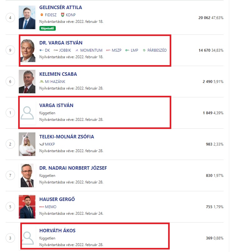 A két névazonosságra hajtó jelölt közül a függetlennek mondott Varga István – aki a szavazólapon legfelül szerepelt – meglepően sok szavazatot, 1849-et gyűjtött be (4,3 százalék) ezzel negyedik lett. Az ellenzéki összefogás pechjére a szavazólap sorrendjének sorsolásán a függetlennek mondott Varga István került az élre, a DK-Jobbik-Momentum-MSZP-LMP-Párbeszéd támogatással induló dr. Varga csak a kilencedik lett szavazólapon.