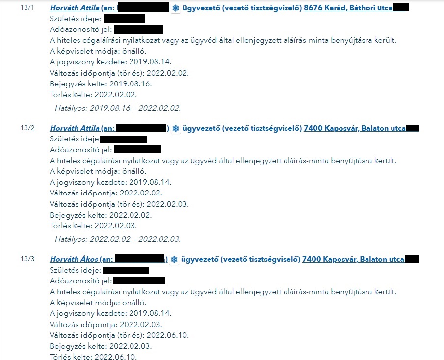 A választások után viszont rövid idővel a fordítottja játszódik le: 2022. június 10-én a cégadatbázisban Horváth Ákos visszakapja az eredeti nevét, a Horváth Attilát, majd 2022. szeptember 28-ával állandó lakhelye ismét Karád.
