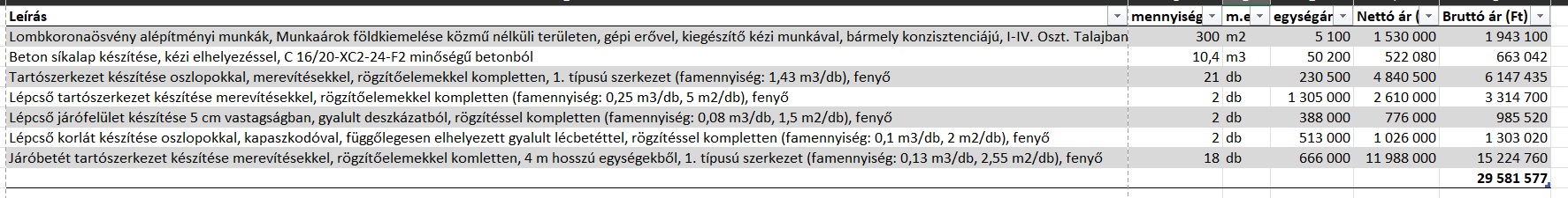 Ha összenézzük mindezt a lombkorona sétány rendelkezésre álló számláival, akkor láthatjuk, hogy a fenti munkanemekbe belekalkulálták az anyagárakat is. Így sajnos lehetetlen azt kibogozni, hogy pontosan milyen faanyagárral számoltak.