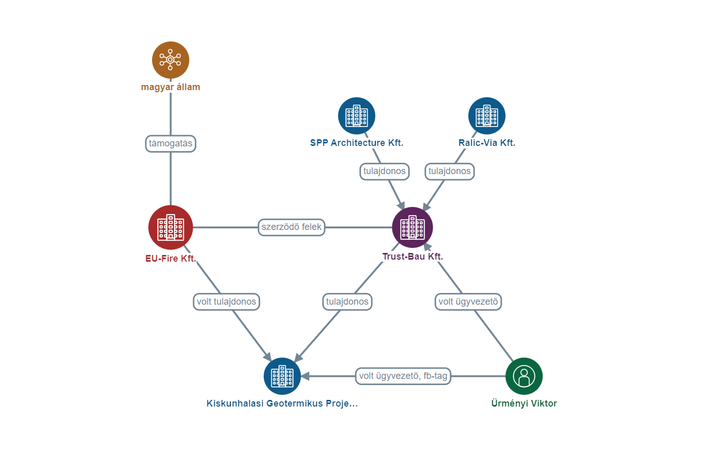 Az EU-Fire cégszerűen köthető volt a megbízást elnyerő Trust-Bau Kft.-hez. A kft. ügyvezetője Ürményi Viktor volt 2019 januárja és 2021 januárja között. Ürményi ezzel párhuzamosan (2020 novembere és 2021 júniusa között) a Kiskunhalasi Geotermikus Projekt Kft.-ben is felügyelő bizottsági tag volt, majd ugyanitt ügyvezető 2022 májusáig. A Kiskunhalasi Geotermikus Projekt Kft. tulajdonosa pedig az EU-Fire volt egészen 2022 augusztusáig.