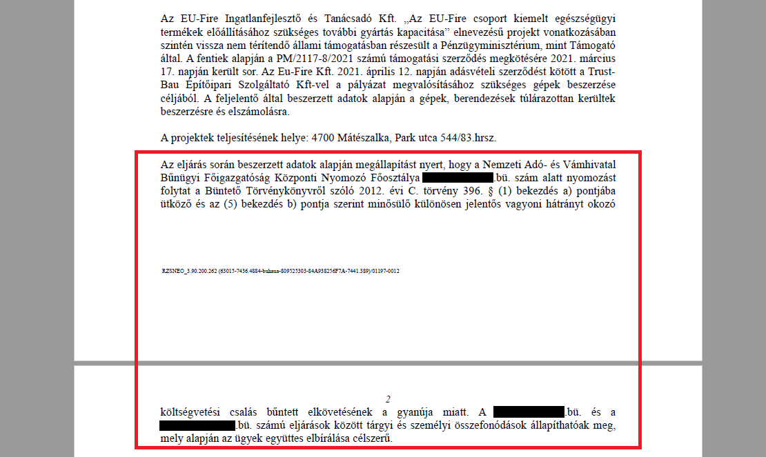 A feljelentés szövege szerint „a rendelkezésre álló tényadatok és körülmények alapján fennáll a gyanú, hogy az EU-Fire Ingatlanfejlesztő és Tanácsadó Kft. részéről tudatosan mesterségesen megemelt áron, jelentősen túlárazva kerültek beszerzésre a költségvetési támogatásból finanszírozott „ETP2” és „ETP3” pályázati projektjei esetében a csatolt kimutatásban szereplő több gép és berendezés, mintegy 1,9 Milliárd forint összeg jogtalan megszerzése érdekében tévedésbe ejtve és tévedésben tartva a támogató szervezetet,