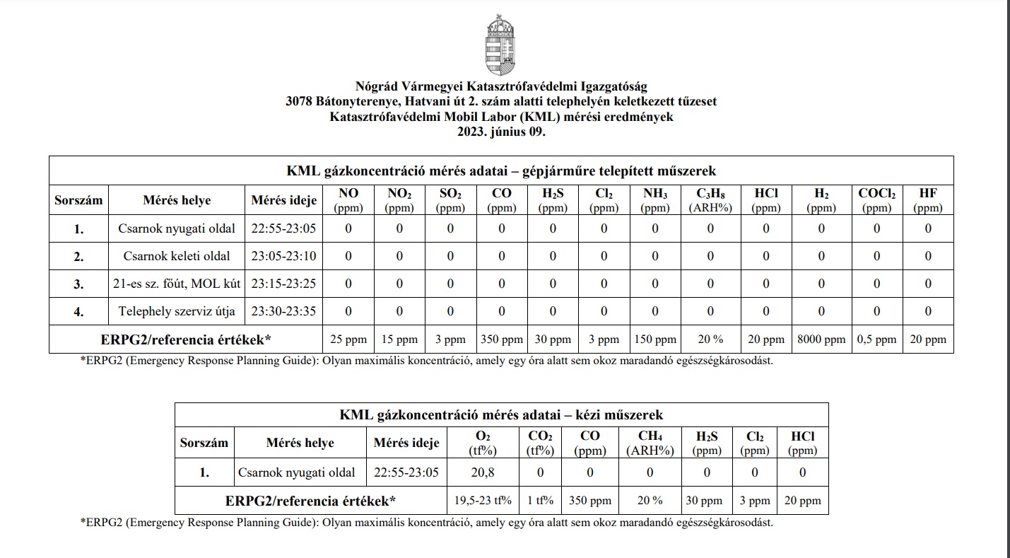 „Az épületen kívül és a telephely közelében végzett mérések során veszélyes gázkoncentráció nem volt kimutatható, lakosságvédelmi intézkedésre nem volt szükség” – olvasható a vármegyei katasztrófavédelem oldalán. A hatóság által közzétett dokumentumban a legkorábbi mérés ideje 22 óra 55 perc, miközben a polgármester 21 óra 27 perckor már azt mondta, hogy eloltották a tüzet.