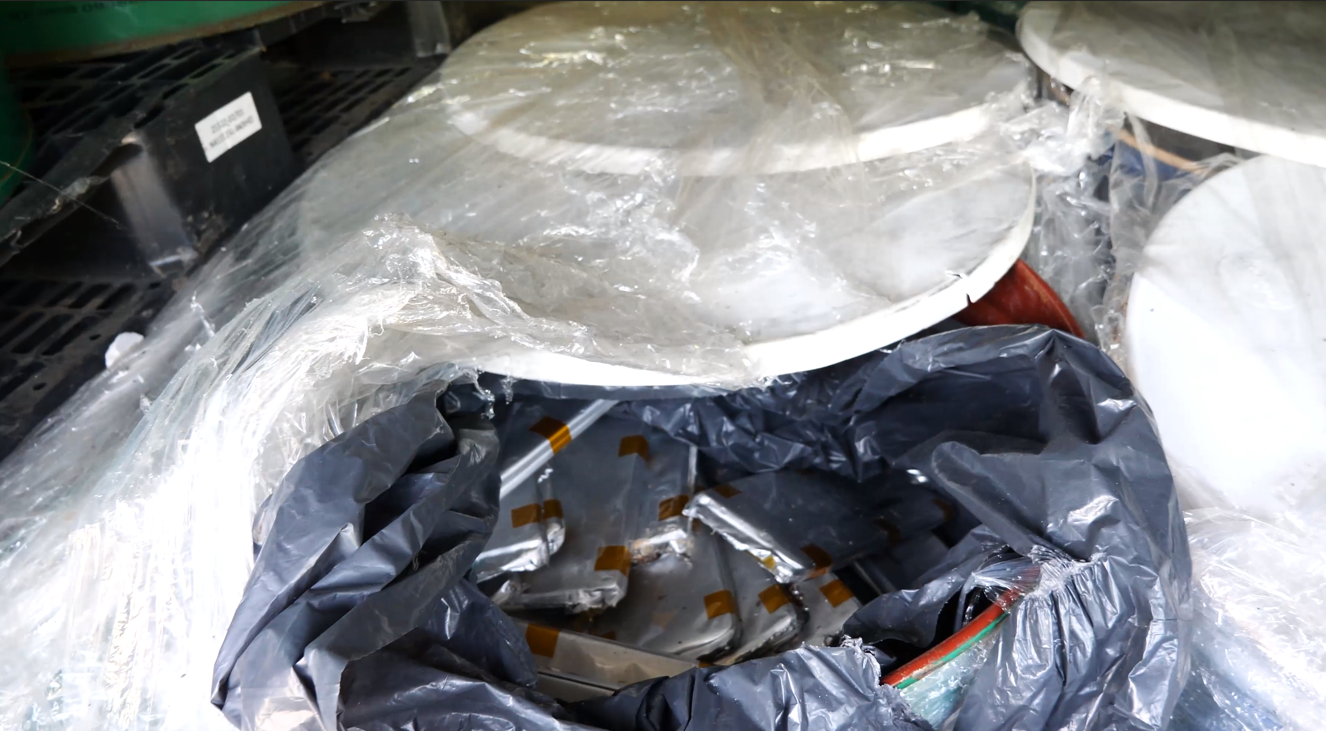 A csarnokok belsejéről fotókat is kaptunk olvasónktól, melyeken az ott tárolt hordók, azokban pedig lítium-ionos akku-cellák láthatók.