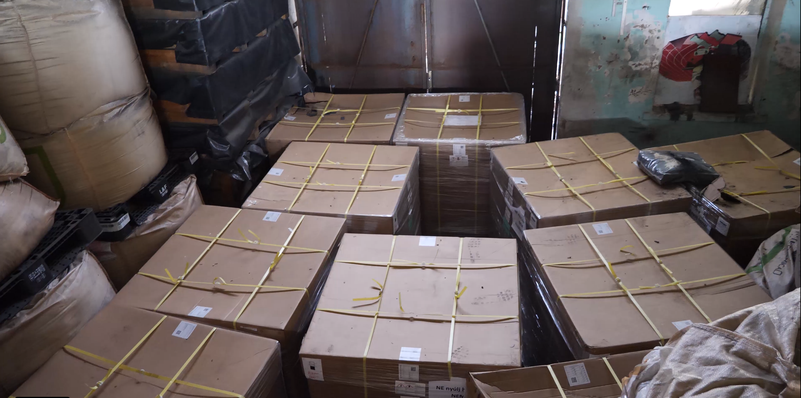 Az épületben lévő dobozokon a „Ne nyúlj hozzá! Nem kiszállítható!” felirat olvasható. A dobozok egy része fóliázott, vagy szalaggal lezárt, de vannak sérült, nyitott dobozok is. A rajtuk lévő feliratok feltételezhetően a bennük lévő anyagokra és azok származási helyére utalnak.
