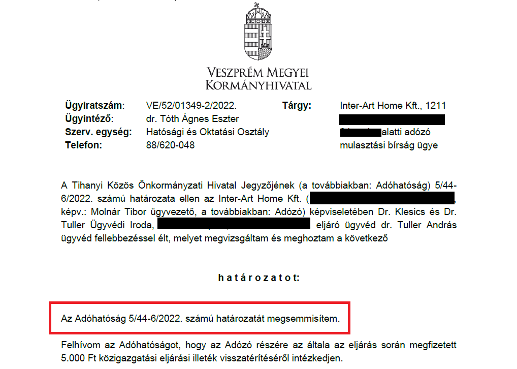 A kormányhivatal megvizsgálta a fellebbezést és a jegyző mint adóhatóság 100 ezer forint mulasztási bírságról rendelkező határozatát megsemmisítette. A kormányhivatal a döntését azzal indokolta, hogy nem állja meg a helyét a hatóság azon állítása, miszerint a kemping nem működik, így telekadót kellene fizetnie az önkormányzat részére.