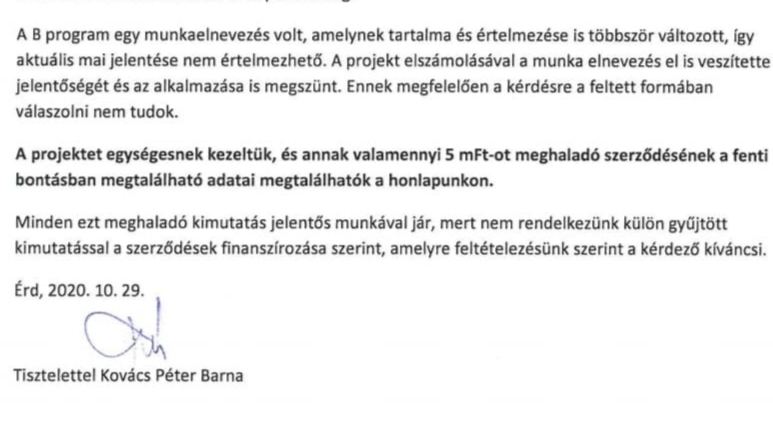 Kovács Péter Barna akkor azt írta az Átlátszónak „A B program egy munkaelnevezés volt, amelynek tartalma és értelmezése többször is változott.” Hozzátette: „A projekt elszámolásával a munkaelnevezés is elvesztette értelmét és az alkalmazása is megszűnt”.