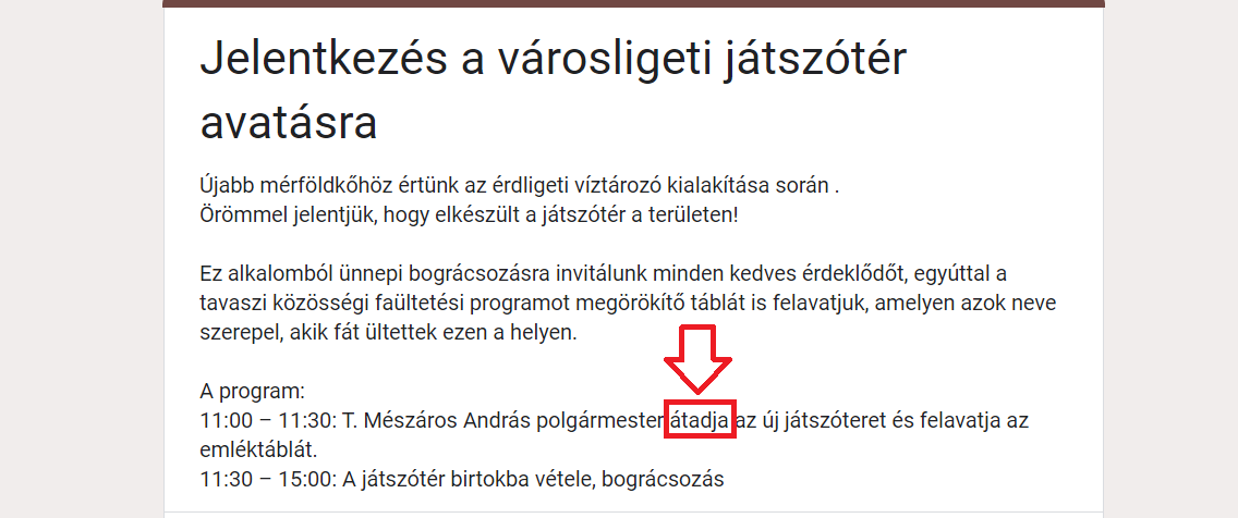 A játszóteret ténylegesen T. Mészáros András fideszes polgármester nyitotta meg. A ceremónián más fideszes politikusok is megjelentek, köztük Aradszki András, a térség KDNP-s parlamenti képviselője és Simó Károly fideszes érdi alpolgármester.