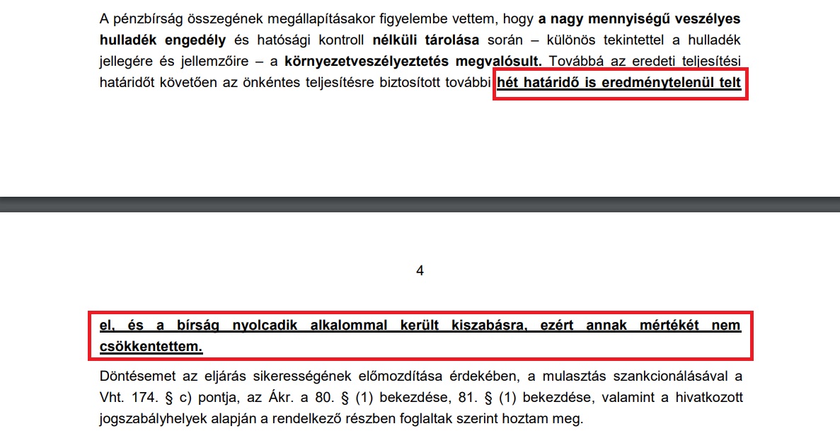 Aztán egy újabb adatigénylésünk nyomán kiderült: a megbírságolt vállalkozó csupán 6 tonna „alumínium-forgácsot” szállított el a helyszínről és a több mint ezer, akku-cellákat tartalmazó hordó ott maradt. Emiatt augusztus közepén újabb félmillió forintos végrehajtási bírságot szabtak ki az illegális raktározás elkövetőjére. A büntetésről szóló végzés szerint annyi történt, hogy a vállalkozó „újracsomagolta” és átcímkézte a hordókban lévő hulladék egy részét, mivel azokon korábban nem jelölték a veszélyességet jelölő besorolást. Ám a hulladékot ezután sem szállították el, a hatóság hiába szabott ki szeptemberben és októberben újabb hét, egyenként félmillió forintos bírságot.