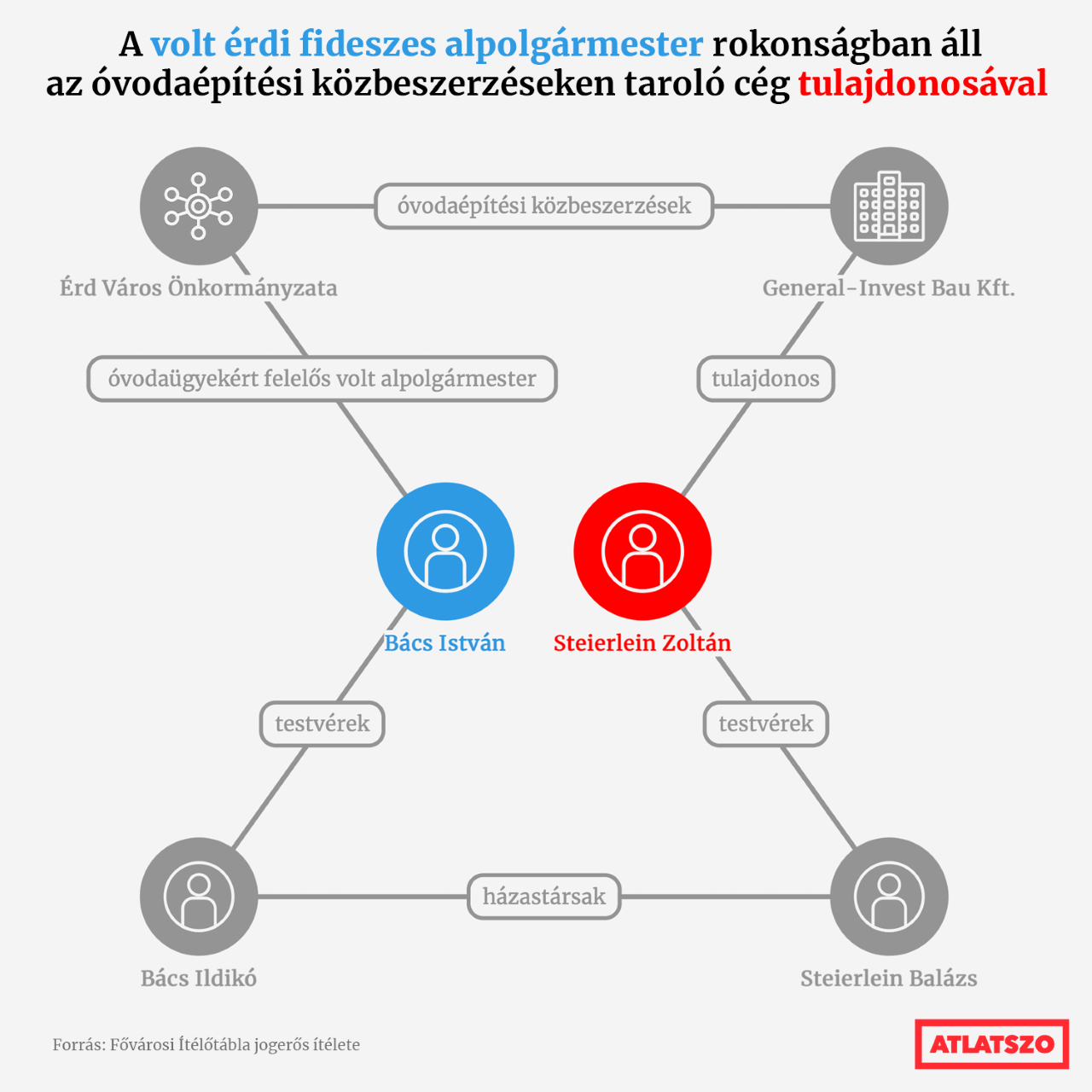 Az óvodaépítési közbeszerzések nyertese és legnagyobb haszonélvezője a General-Invest Bau Kft.. Ez a cég a város fideszes volt alpolgármesteréhez, Bács Istvánhoz köthető, miközben a politikus felügyelte az érdi óvodaberuházásokat. A kivitelező cég tulajdonosa rokona Bács Istvánnak, a vállalkozó fivére ugyanis feleségül vette a politikus testvérét.