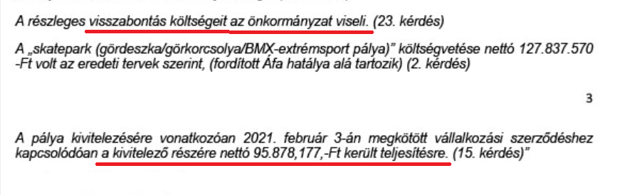 A hatóság újból megkereste az önkormányzatot, mert pont a pénzügyekkel kapcsolatos kérdésekre felejtettek el válaszolni. Marics végül 3,5 hónap után kapta meg az összes kérdésére a válaszokat: kiderült, a visszabontás költségeit az önkormányzat állta, a kivitelezőknek pedig nettó 128 millió forintból nettó 95,9 millió forintot kifizettek a munkáért. Az önkormányzat válasza szerint több alkalommal is tartottak fórumot, ahol a sport iránt aktívan érdeklődők elmondhatták igényeiket a pálya kialakítása kapcsán.