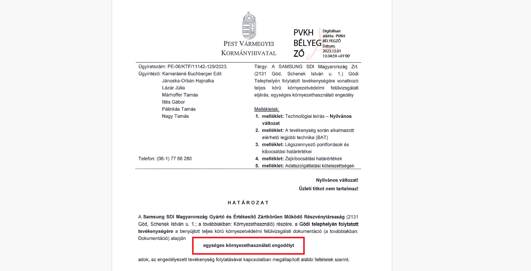 Korábban több cikkbenmegírtuk, hogy szeptemberben teljes körű környezetvédelmi felülvizsgálati eljárást rendelt el a hatóság a gödi akkugyár ügyében. Erre elvileg azért került sor, mert a beruházás területén megépülő második gyár nagy teljesítményű hőtermelő kazánjainak üzembe helyezése előtt a Samsung Zrt. nem szerezte meg a kötelező környezethasználati engedélyt. A Pest Vármegyei Kormányhivatal egy júniusi határozatában ki is mondta, hogy a gödi gyár „egységes környezethasználati engedélyezés hatálya alá tartozó tevékenységet kezdett meg és folytat – ilyen engedély nélkül.”