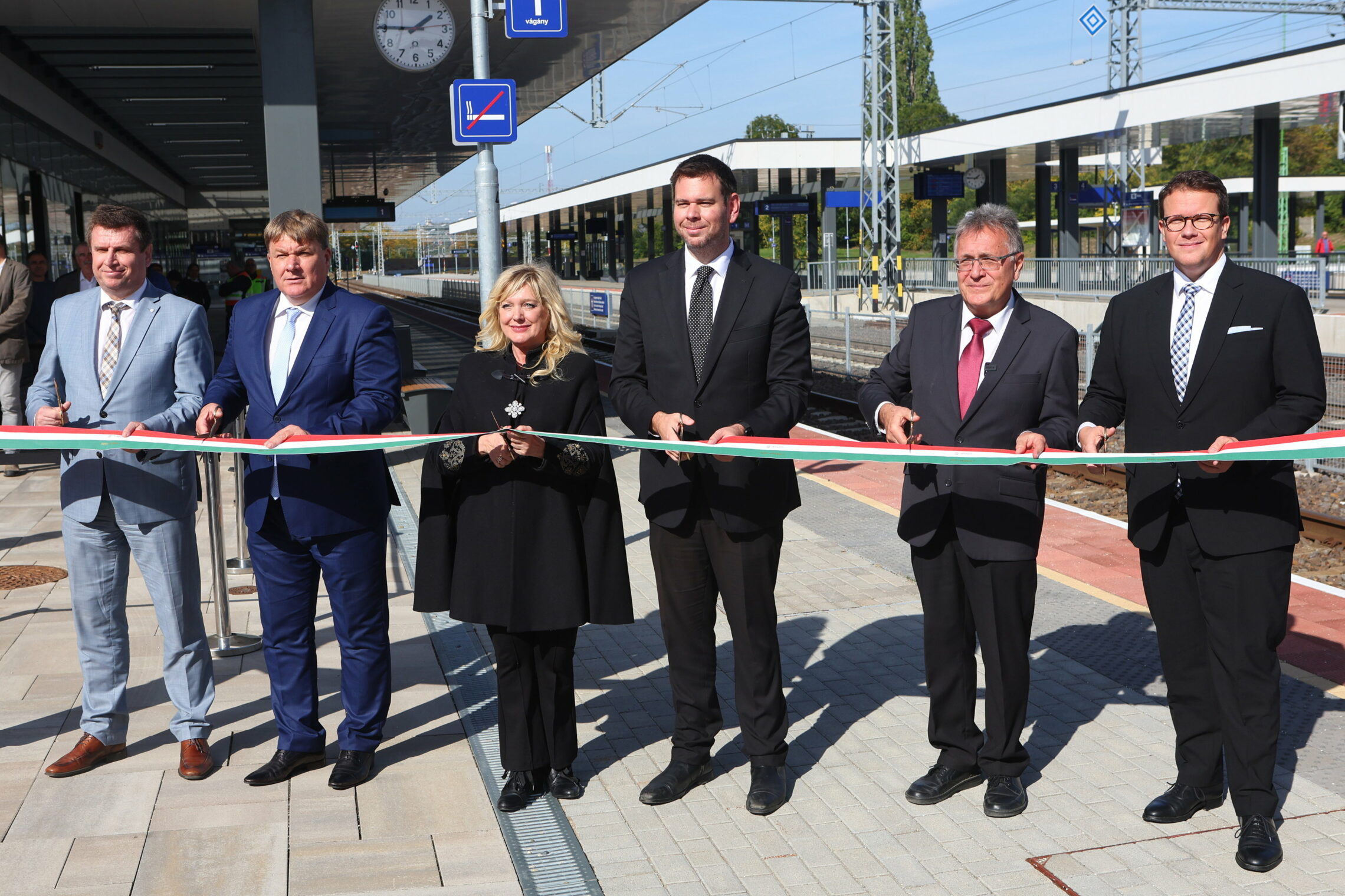Balról jobbra: Nyul Zoltán, a Nemzeti Infrastruktúra Fejlesztő (NIF) Zrt. beruházási vezérigazgató-helyettese, Szűcs Lajos (Fidesz), Vecsés és térsége országgyűlési képviselője, Dunai Mónika (Fidesz), a főváros XVII. kerületének országgyűlési képviselője, Vitézy Dávid, a Technológiai és Ipari Minisztérium közlekedésért felelős államtitkára, Vécsey László (Fidesz), Gödöllő és térsége országgyűlési képviselője, Pafféri Zoltán, a MÁV elnök-vezérigazgatója átvágja a nemzeti színű szalagot a 160 milliárd forintból megújult Budapest-Hatvan vasúti vonalszakasz átadóünnepségén a gödöllői vasútállomáson 2022. október 7-én. (MTI/Kovács Anikó)