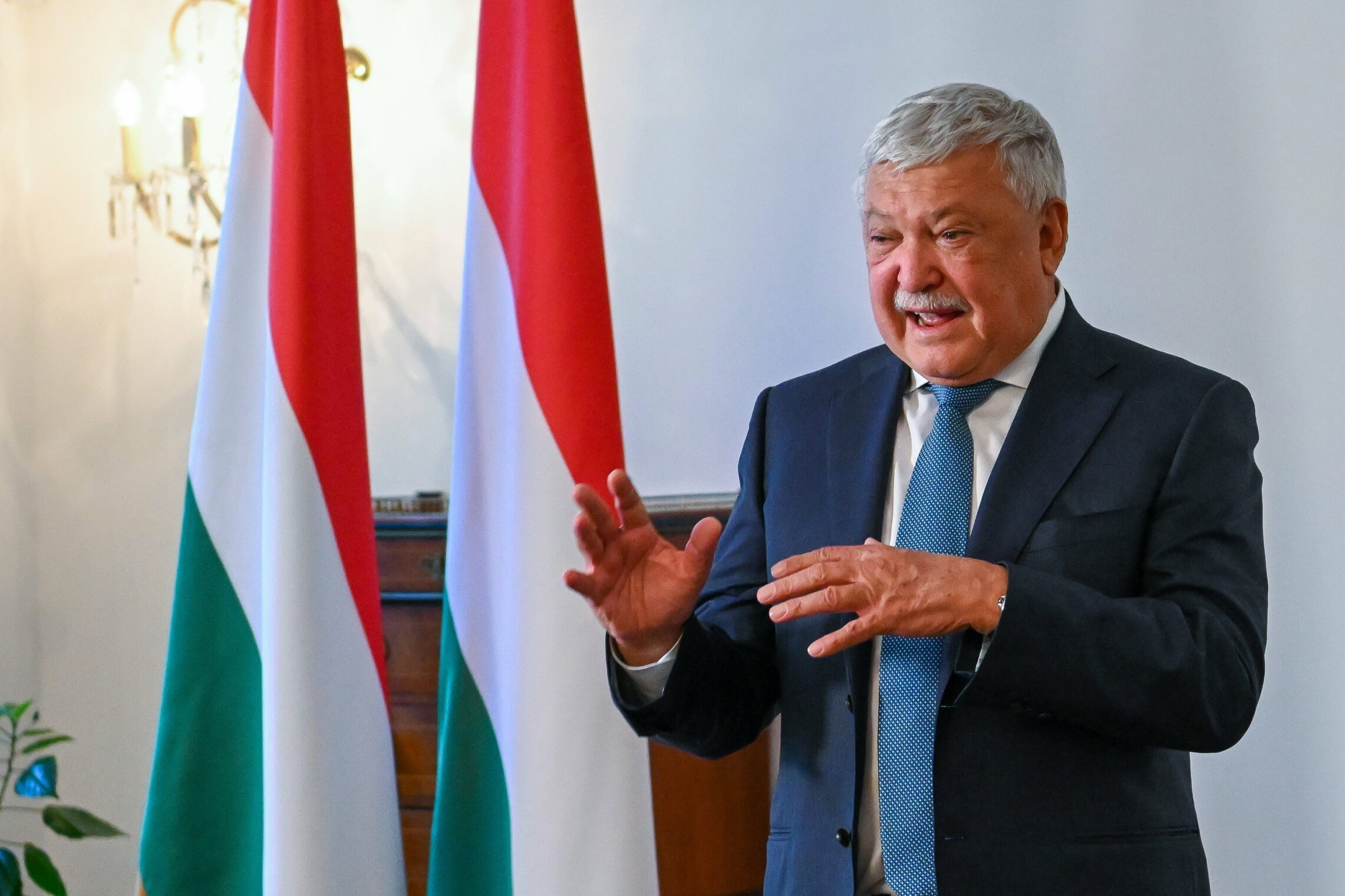 Csányi Sándor, a Magyar Labdarúgó-szövetség elnöke beszédet mond, miután magyar állampolgársági esküt tett Marco Rossi, a magyar válogatott olasz szövetségi kapitánya és Cosimo Inguscio másodedző Budapesten 2023. október 3-án. (MTI/Illyés Tibor)