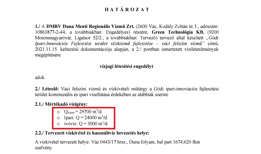 Jávor leírja, hogy a gödi iparterület vízellátásához az épülő új vízi-közművek 2022-ben kiadott engedélye – erről az Átlátszóban mi is beszámoltunk korábban – napi 29.700 köbméter vízkivételt biztosít, melyből 24.000 köbméter az ipari víz, és 3000 köbméter az ivóvíz. A bővülő akkumulátorgyár vízigényét kiszolgáló 32 milliárdba kerülő beruházást a Mészáros és Mészáros Kft végzi.