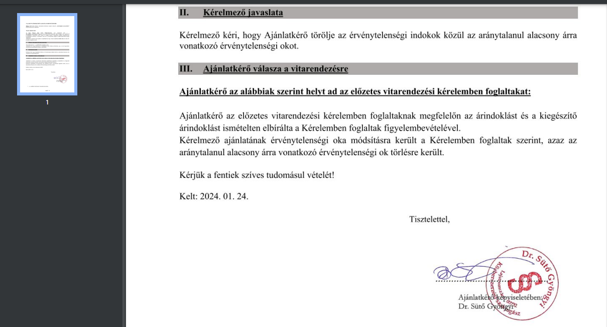Az önkormányzat helyt adott a panasznak, és törölte ezt az érvénytelenségi okot. A DML Hungary mégsem örülhetett a döntésnek. Ugyanis nem emiatt, de végül mégis kizárták a versenyből.
