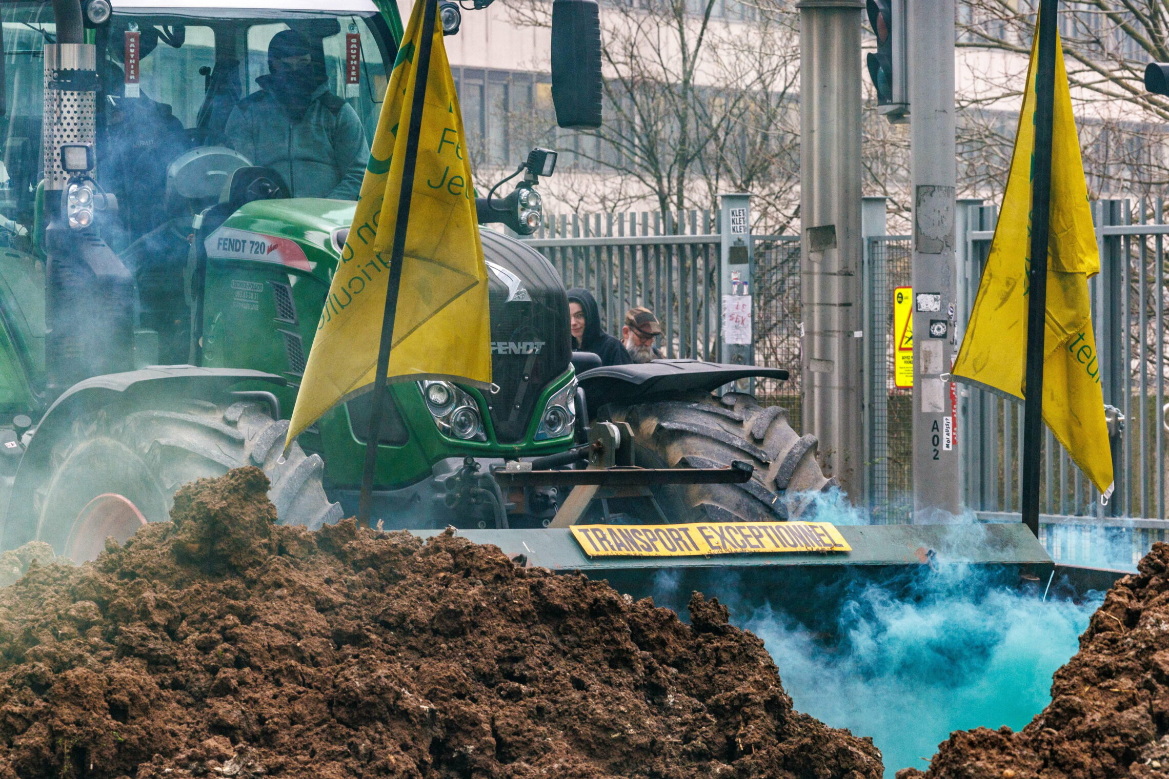 Az európai agrárpolitika, valamint az alacsony bérek és támogatások miatt tüntető gazdák földet szórnak a tüntetők által meggyújtott fáklyák közé Brüsszelben 2024. március 26-án. Az Európai Unió Mezőgazdasági Tanácsának brüsszeli ülése idején több száz traktorral és munkagéppel vonultak fel elégedetlen gazdák az uniós intézményeknek otthont adó európai negyedben.