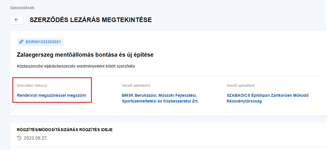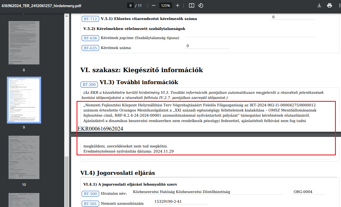 Az eljárás azonban feltételes volt, tekintettel arra, hogy az Ajánlatkérő (Gazdaság-újraindítási Akcióterv) támogatási igényt nyújtott be, azonban a projekt támogatási szerződése még nem került aláírásra. Emiatt az ajánlatkérő „a támogatásra irányuló igény el nem fogadását vagy az igényeltnél kisebb összegben történő elfogadását olyan körülménynek tekinti, amely miatt az eljárást eredménytelenné nyilváníthatja”.