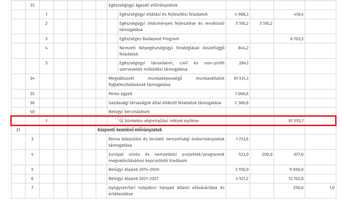 Az építkezés áráról a BvOP a következőket írta: „a Magyarország 2024. évi központi költségvetéséről szóló 2023. évi LV. törvény XIV. Belügyminisztérium fejezete tartalmazza a biztosított forrást.” Megnéztük a hivatkozott törvényi helyet, ahol egyetlen sort találtunk, ami a csengeri börtönre vonatkozhat.
