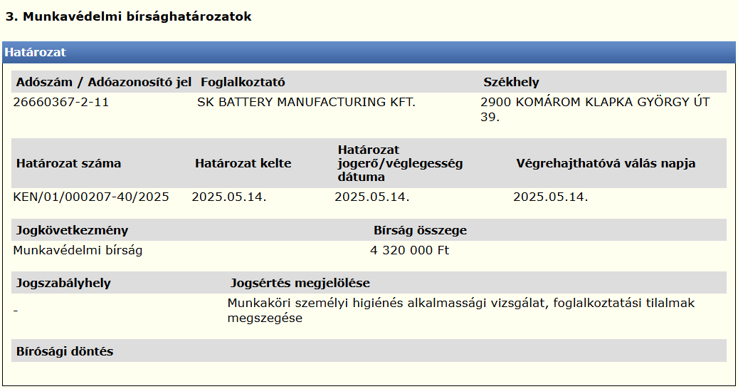 2025 május 14-én kiadott munkavédelmi bírság az SK Battery Manufacturing Kft. számára. (Forrás: nyilvantartas.ommf.gov.hu)