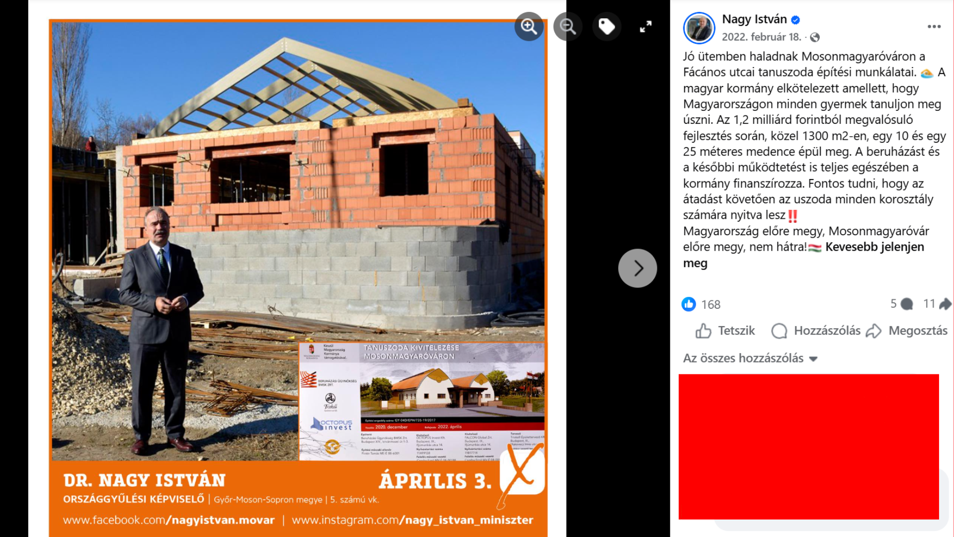 Elvileg tehát 2022-ben át kellett volna adni a létesítményt, és Nagy István kampányolt is vele az akkori, 4 évvel ezelőtti országgyűlési választás előtt. A 2022. február 18-i Facebook-bejegyzésében azt írta, hogy „Jó ütemben haladnak Mosonmagyaróváron a Fácános utcai tanuszoda építési munkálatai”. A mellékelt kép a szerkezetkész épület előtt álló agrárminisztert és a leendő tanuszoda látványtervét mutatja, az alján pedig egy Nagy Istvánra való szavazásra való felhívás látható.