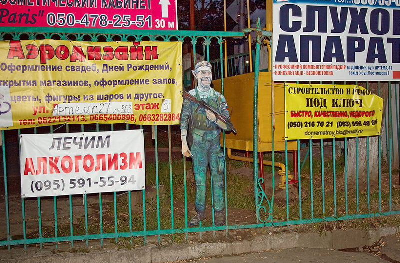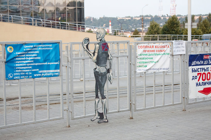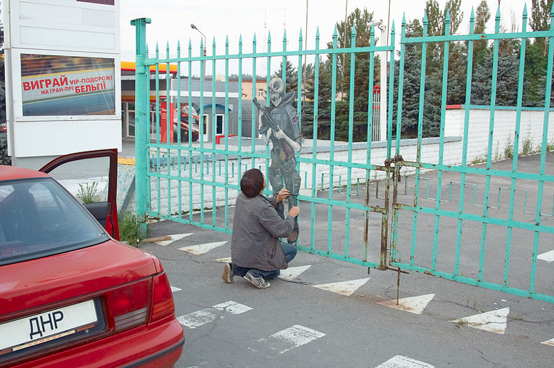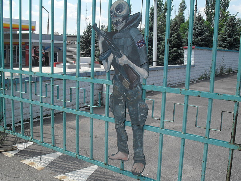 Zaharov és az általa alapított Myrzilka csoport július folyamán kezdte elhelyezni Donyeck közterein a furnérlemezből kivágott, a „kis zöld embereket” gúnyoló figuráit. Egyik alkotásuk – mely a lázadók egyik vezérét, Igor Sztrelkovot ábrázolja, halántékához szorított pisztollyal és a jól ismert „Just do it!” szlogennel – gyorsan az ellenállás szimbólumává vált.