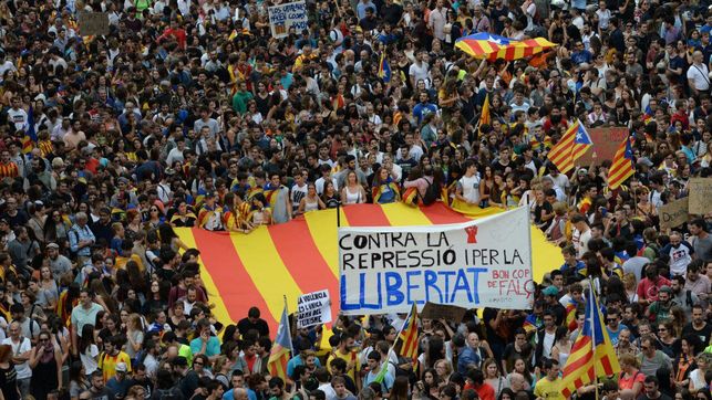 a függetlenségpártiakon jóval túlmutató, szélesebb egységet kovácsolt Katalóniában – miközben az ország egészében szerveztek szolidáris akciókat, Madridban pl. vasárnap este. Hétfőn nemcsak az eddig is nagyon aktív diákok hívtak tüntetésre – „A nagymamáinkhoz senki sem nyúl” szlogennel, majd papírrepülőkkel: „Ezek a fegyvereink”. De újabb szakmai kollektívák is bekapcsolódtak az akciókba, pl. az országosan is egyik legnagyobb katalán pénzintézet, a CaixaBank több száz dolgozója néhány percre lezártak a város egyik sugárútját. És ritkán látott fotón, együtt tiltakoztak 10 perces néma csenddel a Generalitat, Barcelona városa és a legnagyobb szakszervezetek vezetői is.