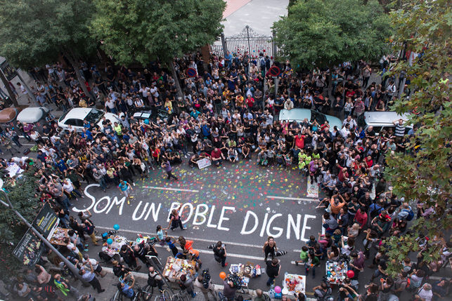 Több tüntetés is zajlik, a spanyol rendvédelem helyi székhelye vagy a legdurvább atrocitásoknak helyt adó iskola előtt, a rendőrök távozását sürgető szlogenek ellenére, vidám hangulatban.